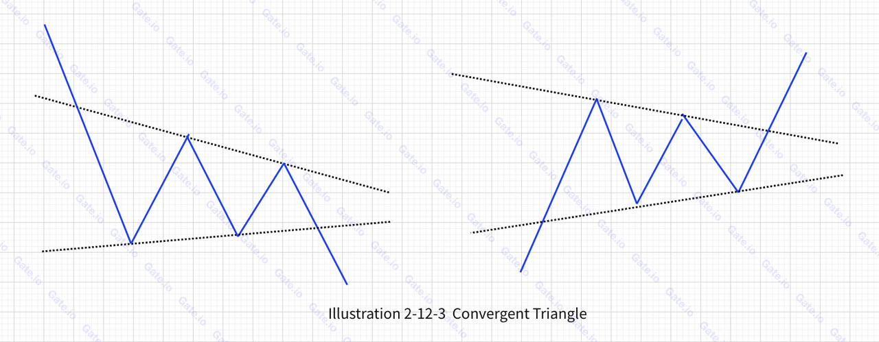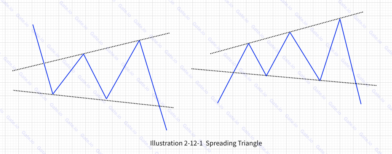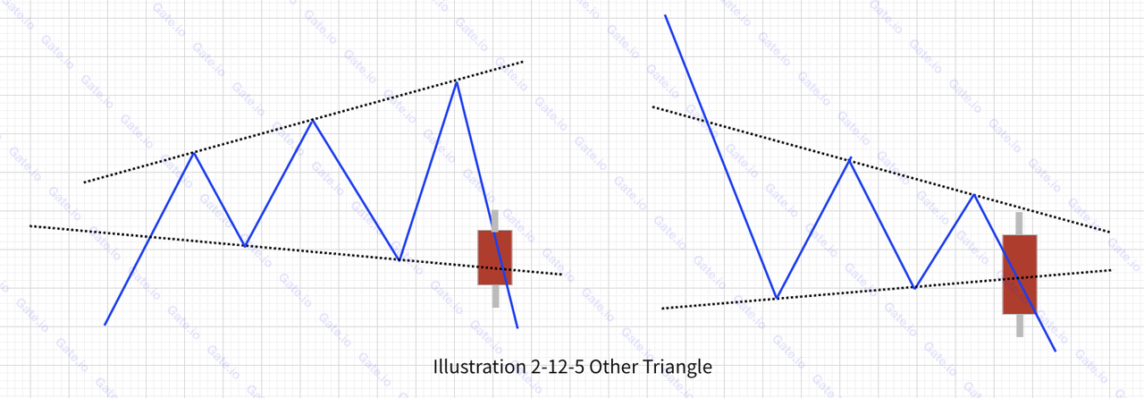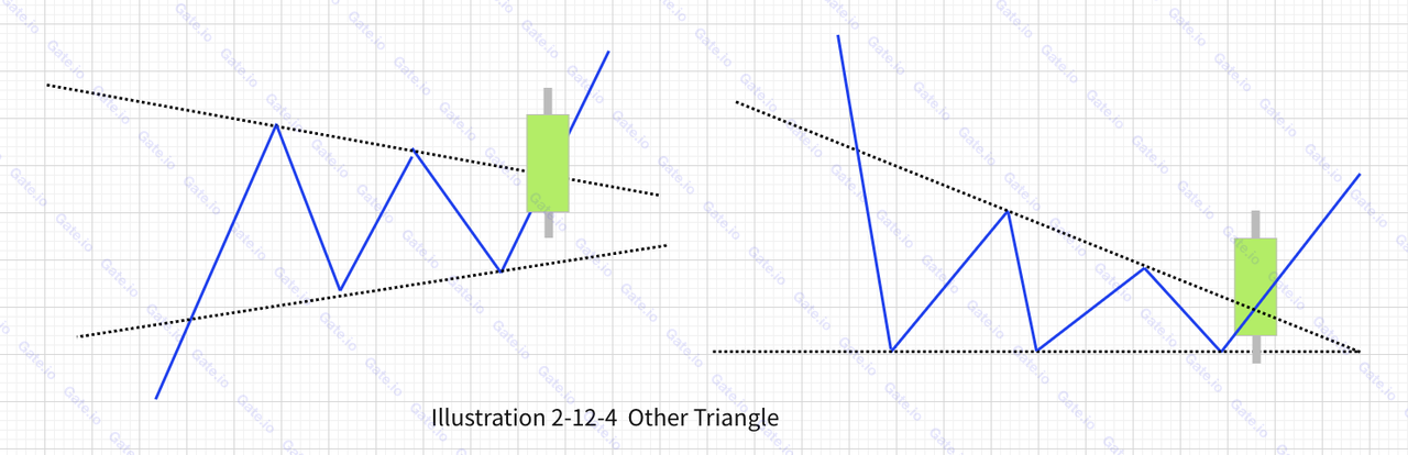بالإضافة إلى المثلثات الصاعدة والهابطة التي تمت مناقشتها في الأقسام السابقة، تظهر أشكال مثلثات أخرى مختلفة أحيانًا في التداول الفعلي. هذه تحمل إشارات تجارية هامة. ومن الجدير بالذكر أن هذه تشمل المثلثات الأساسية، والمثلثات المتباعدة (على شكل مكبر الصوت)، والمثلثات المتقاربة. ويمكن رؤية الأمثلة في الشكل أدناه: