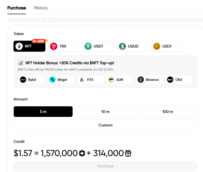 أما في الدفع، تستبدل منصة AINFT الاشتراكات الجامدة بنظام نقاط مرن حسب الاستخدام. يدفع المستخدمون فقط مقابل ما يستهلكونه، دون رسوم شهرية أو سنوية، ما يقلل التكاليف بشكل كبير. تدعم المنصة الشحن المصغّر باستخدام TRX وNFT وUSDT وأصول رقمية أخرى، ويمكن استخدام الرصيد عبر جميع النماذج بعد شحنة واحدة فقط. هذا مثالي للمستخدمين غير الدائمين ذوي القيمة العالية، حيث يدفعون فقط مقابل الاستخدام الفعلي، ويستفيدون من مرونة الدفع.