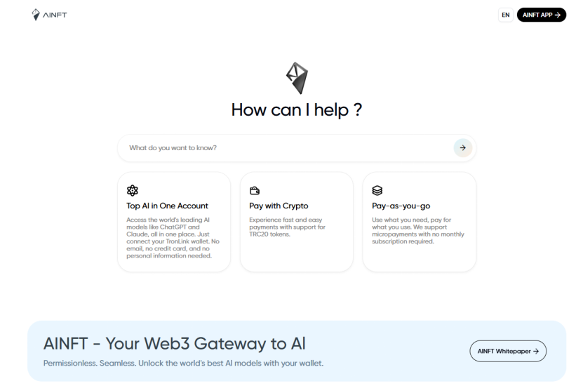 تقدم AINFT نفسها كبوابة تجميع خدمات ذكاء اصطناعي للويب 3. وتوفر منصة تجميع النماذج الضخمة الأصلية للويب 3 تجربة دفع سلسة وغير مقيدة على السلسلة. وبفضل نظام دفع بالعملات الرقمية، تجمع المنصة بين أبرز نماذج الذكاء الاصطناعي العالمية — مثل ChatGPT وClaude وGemini — في نقطة دخول موحدة. يستفيد المستخدمون من عدم الحاجة إلى ربط البطاقات أو الاشتراكات الثابتة، مع إمكانية الوصول الفوري بعد الشحن ونظام تسعير مرن حسب الاستخدام. كما توفر AINFT واجهات برمجة تطبيقات موحدة لنظام الويب 3، ما يمكّن المطورين من إطلاق تطبيقات ذكاء اصطناعي مبتكرة بسرعة.