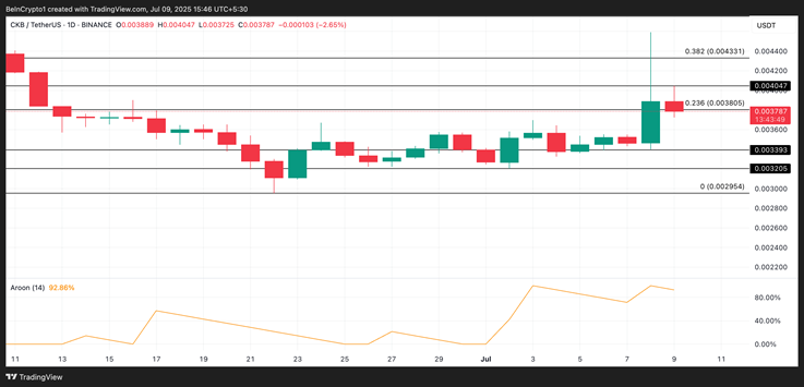 كمثال على CKB، عندما تقترب Aroon Up من 100، تعكس الهيمنة الزائدة للاتجاه الصعودي. بعبارة أخرى، فإن ضغط الشراء قوي، وقد يستمر سعر CKB في الارتفاع.