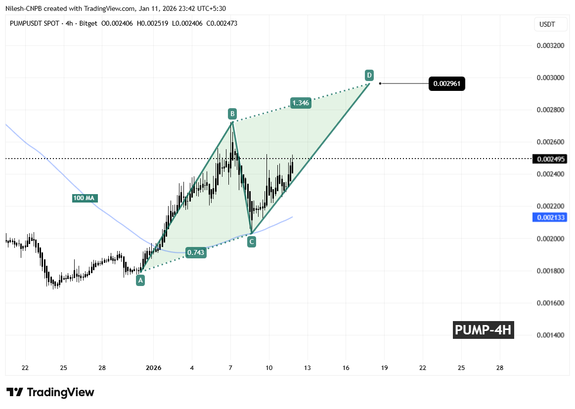 منذ الارتداد من نقطة C، استأنف PUMP تقدمه ويُتداول الآن حول منطقة $0.0025، مما يشير إلى أن موجة CD تتطور بنشاط.