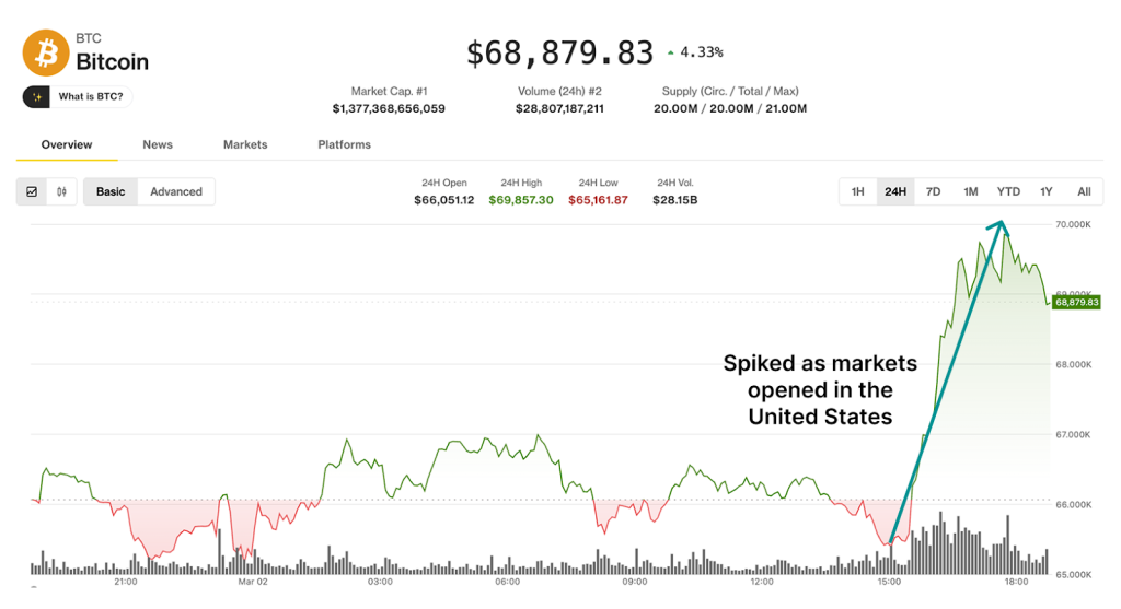 تركّز أخبار العملات الرقمية اليوم على أداء بيتكوين مقارنة مع السلع مثل الذهب والنفط، بالإضافة إلى أسواق الأسهم حول العالم. مع بداية الأسبوع في آسيا، كان بيتكوين يتراجع خلف الذهب وخصوصًا النفط. لكن ثم جاءت وول ستريت بأكثر أخبار العملات الرقمية إثارة اليوم: ارتفاع حاد إلى مستوى 69 ألف دولار مع افتتاح الأسواق في نيويورك.