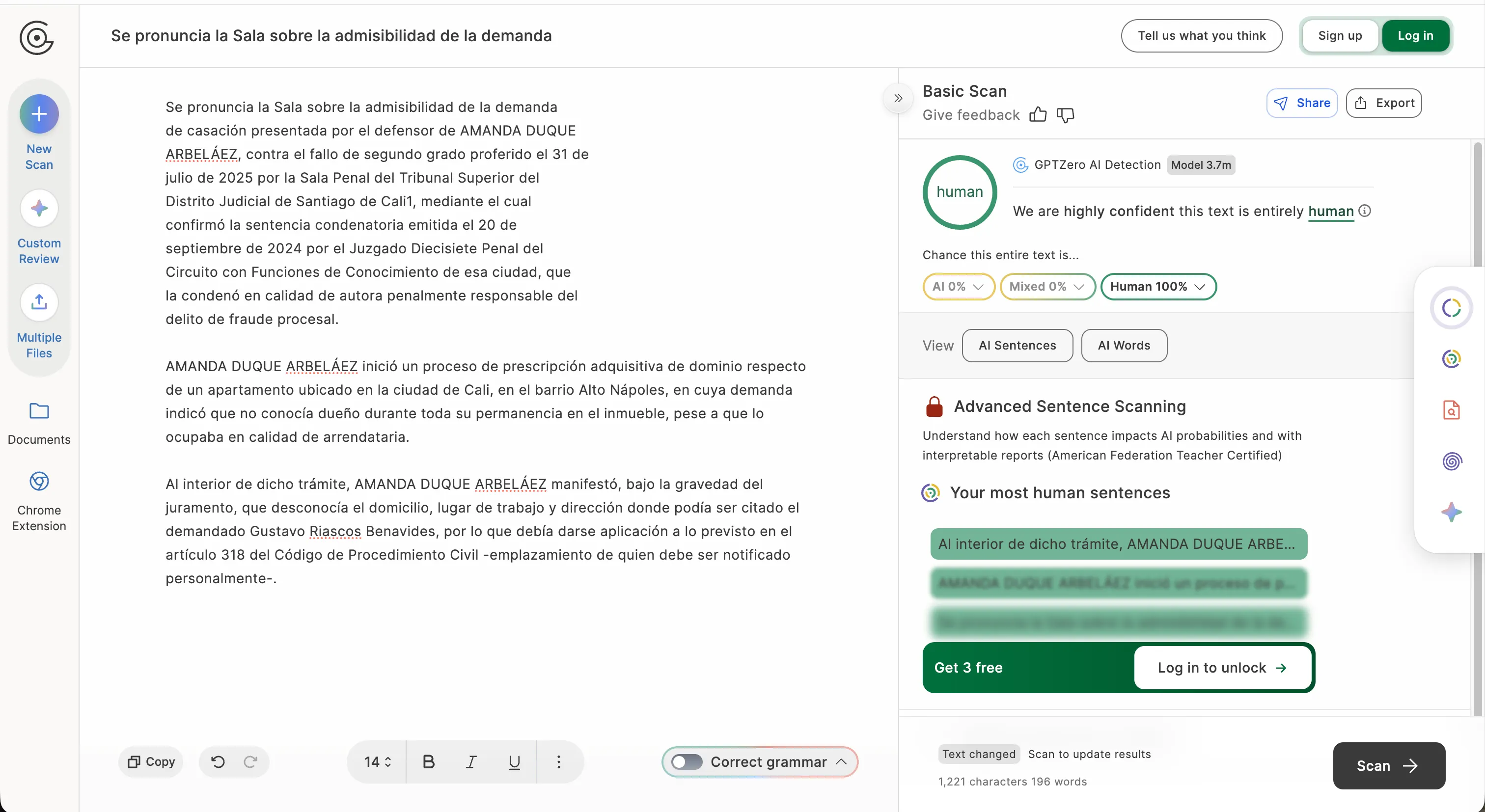 “إذا كانت المحكمة نفسها التي تدين استخدام الذكاء الاصطناعي تحصل على تلك النسبة، فإن هشاشة المنهجية في استخدام هذه الأدوات كدعم حججي تصبح واضحة بذاتها,” قال في تغريدة لاحقة. خلال ساعات من نشر المحكمة سلسلة تغريدات عن القرار على X، بدأ المحامون في إجراء تجاربهم الخاصة. انتشرت منشورات فيلاسكيز بشكل واسع في الأوساط القانونية، وحصدت عشرات الآلاف من المشاهدات. قمنا أيضًا باختبار حكم المحكمة، وفي البداية لم تكن النتائج جيدة. عندما قام GPTZero بمسح الكلمات الافتتاحية فقط من نص المحكمة، أعاد نتيجة 100% ذكاء اصطناعي.
