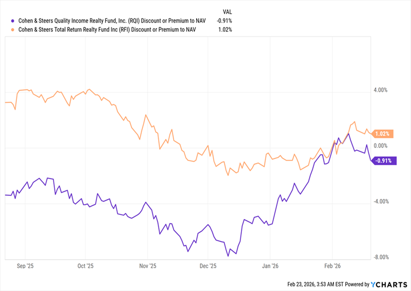 عند كتابة هذا، يتداول صندوق RQI (باللون البنفسجي أدناه) بأقل من القيمة الاسمية، مع خصم بنسبة 0.9% إلى NAV، بينما يتداول RFI (باللون البرتقالي) فوق ذلك، بزيادة قدرها 1%. هنا أيضًا، الاختلافات ليست كبيرة بما يكفي لتكون، بمفردها، عاملاً حاسمًا. مرة أخرى، نحن عالقون.