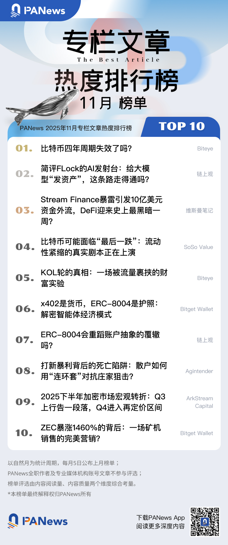 PANews’ November 2025 Columnist Influence Ranking TOP5 und Column Article Popularity Ranking TOP10 (im Folgenden als “Doppelliste” bezeichnet) wurden heute veröffentlicht, und wir haben eine umfassende Bewertung aller Beiträge aller Kolumnisten auf der PANews-Plattform im November sowie der Beliebtheit aller Kolumnenartikel durchgeführt und eine Doppelliste erstellt.