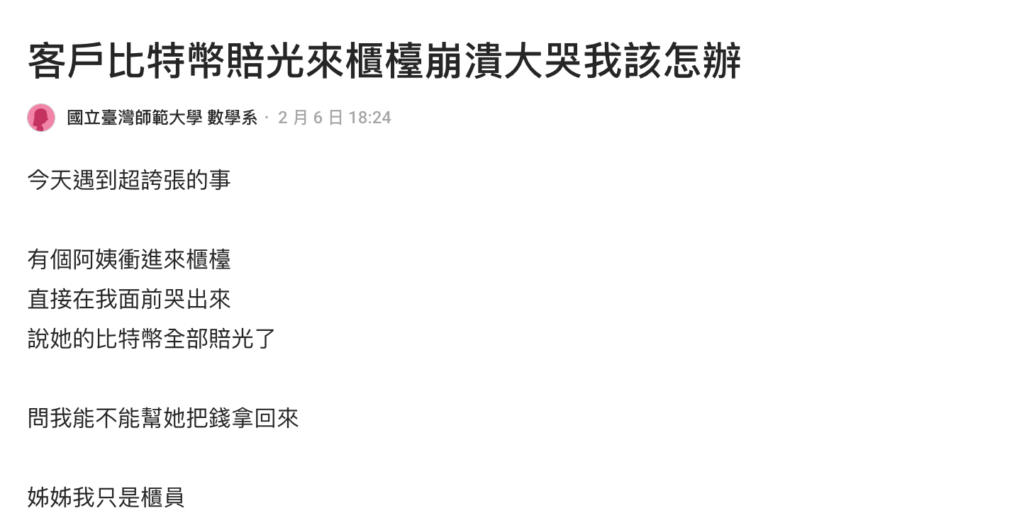 Eine Bankangestellte teilt auf Dcard die Erfahrung eines Kunden, der wegen Bitcoin-Verlusten in die Bank stürmte, zusammenbrach und weinte.