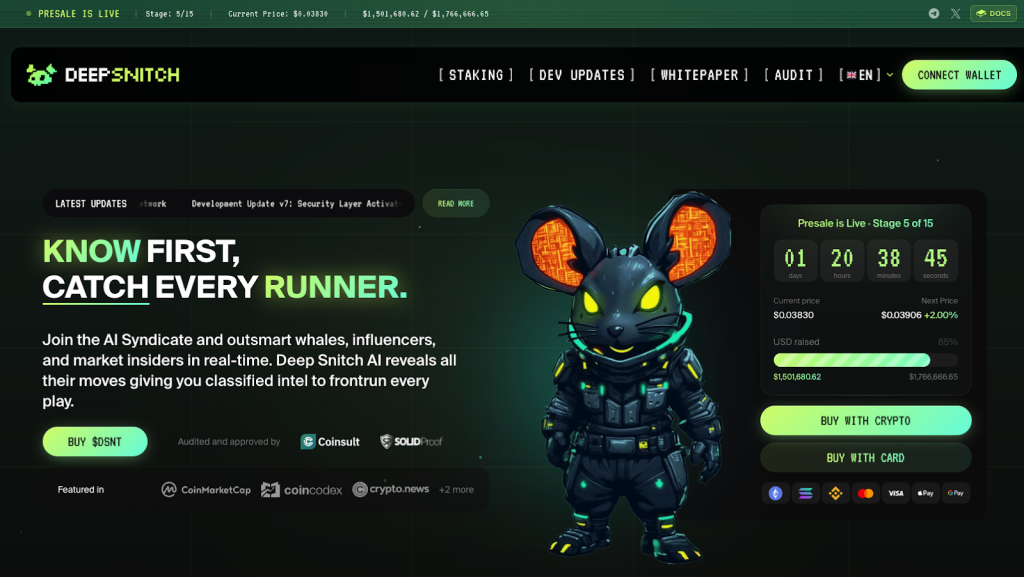 Während die meisten Low-Cap-Pre-Sales noch Schwierigkeiten haben, Relevanz zu beweisen, hat DeepSnitch AI bereits eine Preissteigerung von 150% erzielt, die von den anfänglichen 0,01510 $ auf den aktuellen Stage-5-Preis von 0,03906 $ gestiegen ist. Diese Leistung ist der Grund, warum viele Händler es jetzt zu den besten verfügbaren Krypto-Pre-Sale-Möglichkeiten zählen.