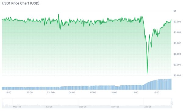In der Zwischenzeit führte die Marktreaktion auf den Bericht dazu, dass USD1 kurzzeitig von seinem Dollar-peg abwich. Laut CoinGecko fiel die fiat-gekoppelte Münze auf 0,994 $, etwa 0,6 % unter 1 $. Allerdings kehrte die Stabilität später am Tag zurück, als sich der Kurs wieder in Richtung Parität bewegte.