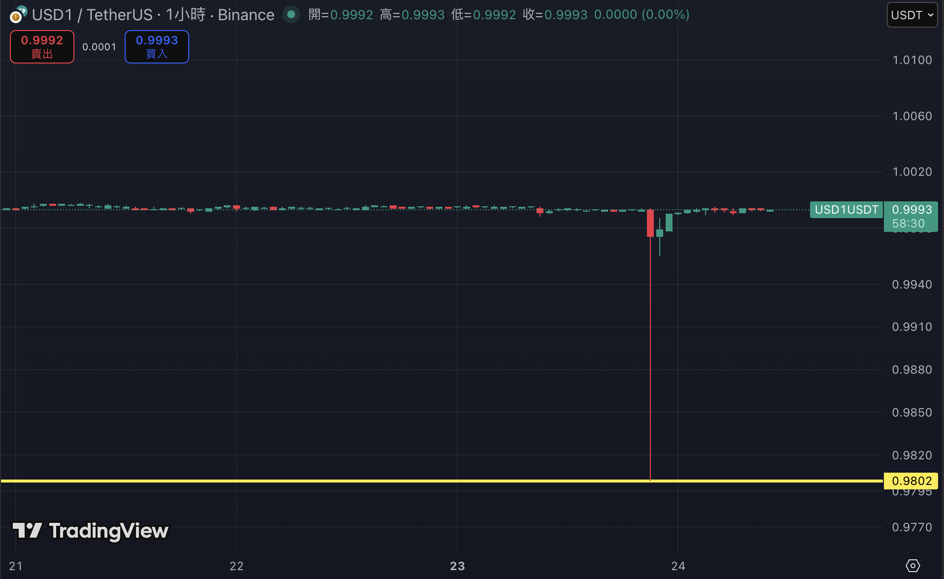 Bildquelle: TradingView Aufgrund der Panik wurde der $USD1-zu-$USDT-Kurs auf Binance kurzzeitig auf 0,9802 gedrückt