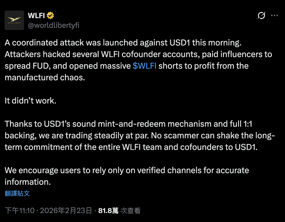 Die offizielle Stelle von World Liberty Financial bestätigte später auf der Plattform X, dass mehrere Gemeinschaftskonten von Mitbegründern durch Hacker kompromittiert wurden und für die Verbreitung falscher Informationen genutzt wurden. Das Statement betonte, dass bei diesem Angriff keine Smart Contracts oder die zugrunde liegende Protokollarchitektur betroffen waren, alle $USD1-Mittel sicher sind und vollständig gedeckt werden.