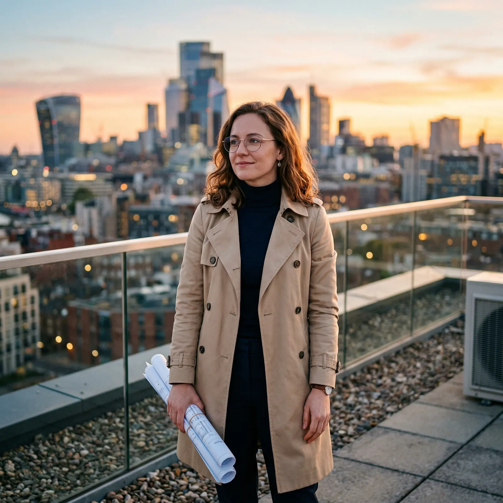 Das Briefing: ein kinoreifes Porträt einer 32-jährigen Architektin auf einem Dach bei Sonnenuntergang, in beigem Trenchcoat und runden Brillen, wobei sie speziell die blauen Druckrollen in ihrer linken Hand hält, im Hintergrund die Skyline leicht unscharf, mit goldenem Licht, weichem Randlicht, flachem Schärfentiefeffekt (50mm-ähnlich), vertikal 4:5, realistische Hauttextur und subtilem Filmkorn.
