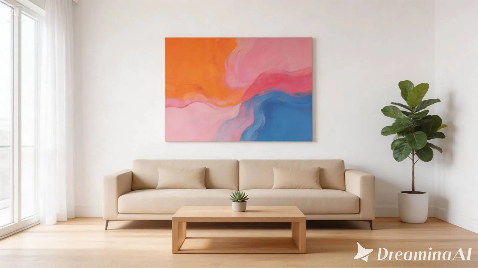 Rechts wurde in eine zweite Wand, gerahmte Kunst und ein niedriger Holztisch erweitert, wobei die minimalistische Materialsprache beibehalten wurde—helles Holz, sanfte Neutraltöne, nichts, was den ursprünglichen Stil widersprach.