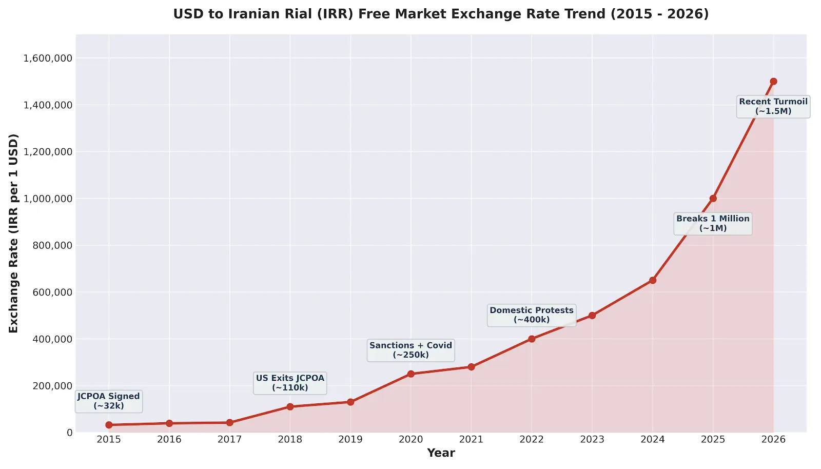 2015, nach dem Abschluss des Atomabkommens (JCPOA), erwartete der Markt eine Entspannung der Sanktionen: Der Wechselkurs lag damals bei etwa 1 US-Dollar zu 32.000 Rial. Seit dem US-Ausstieg 2018 und der schrittweisen Rücknahme der Sanktionen stieg der Rial-Wechselkurs rasch in den Bereich von Hunderttausenden, was den Beginn des „Zehn-Millionen-Rial-Zeitalters“ markierte. Mit der Verschärfung der Sanktionen, Inflation, Währungsknappheit und geopolitischen Konflikten fiel der Rial im ersten Halbjahr 2022 unter eine Million. Anfang dieses Jahres erreichte er bei Protesten einen Tiefstand von 1,5 Millionen Rial.