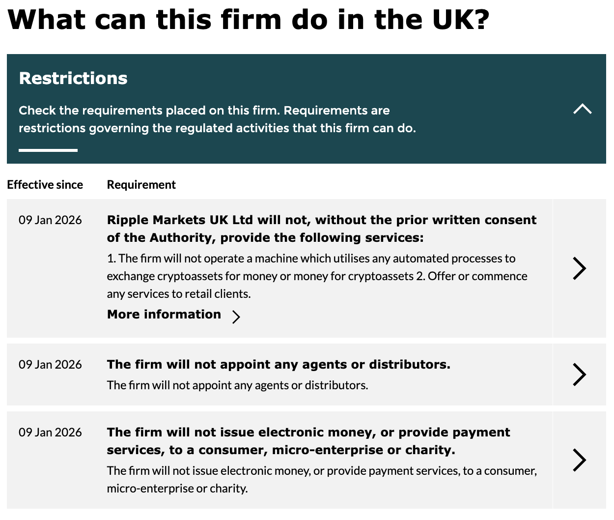 Aunque ha obtenido licencias clave, Ripple en sus primeras etapas en el Reino Unido debe cumplir con ciertas restricciones para mantener la integridad del mercado. Según registros de la FCA, Ripple Markets UK LTD no puede ofrecer servicios de cajeros automáticos de criptomonedas (ATMs), ni proporcionar servicios de pago o emisión de dinero electrónico directamente a clientes minoristas, microempresas o entidades benéficas sin autorización previa por escrito de la autoridad reguladora.