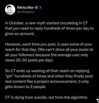 Sin embargo, el momento en que se publicó esta buena noticia coincidió exactamente con una tensión en las relaciones entre X y la comunidad de criptomonedas. Justo un día antes, Nikita Bier publicó (y luego eliminó) una publicación que algunos interpretaron como que «X podría limitar la frecuencia con la que los usuarios activos responden a las publicaciones». Esto generó un gran revuelo en la comunidad de criptomonedas, que valora la alta interacción y la rápida difusión, ya que los usuarios temen que esto pueda sofocar los espacios de discusión orientados a la comunidad, provocando una caída en el alcance.