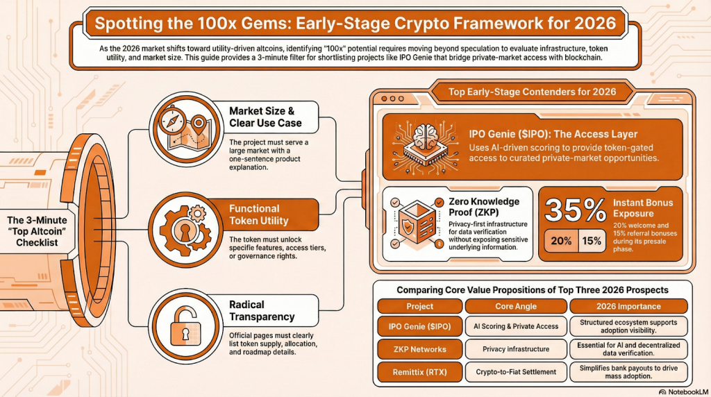 Este artículo sigue una historia sencilla: una forma clara de hacer una lista corta de proyectos en etapa inicial con potencial de 50x-200x en 2026, y por qué IPO Genie sigue siendo parte de esa lista por una razón muy específica. No intenta ser un token más ruidoso. Busca ser una capa de acceso.