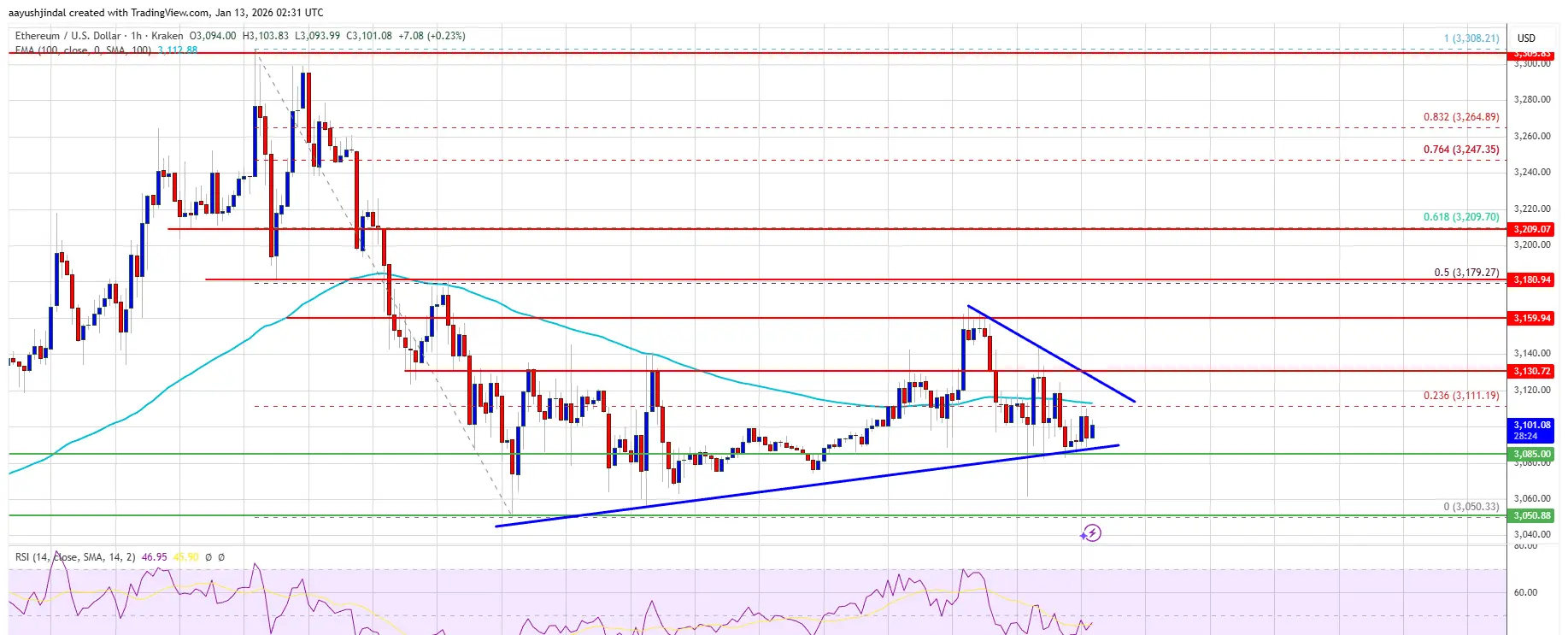 Sin embargo, los bajistas están activos cerca de $3,150 y $3,180. El precio de Ethereum ahora se negocia por debajo de $3,120 y de la Media Móvil Simple de 100 horas. Además, se está formando una línea de tendencia alcista clave con soporte en $3,085 en el gráfico horario de ETH/USD.