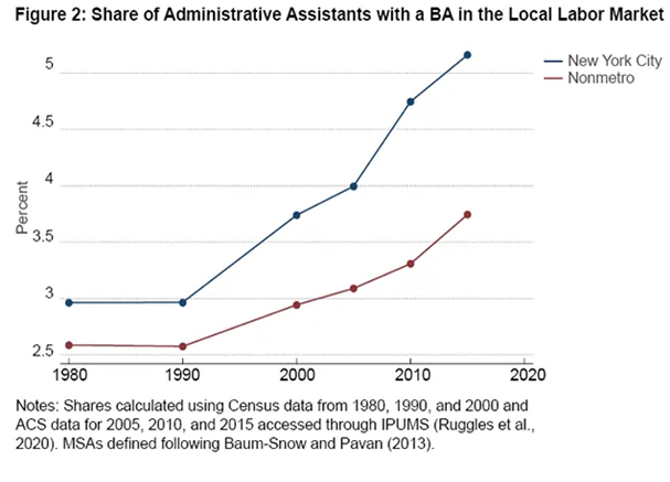 Cuando la computadora se convirtió en una parte importante de los negocios en los años 90, quizás recuerdes que circulaban temores de que las computadoras acabarían con los empleos de nivel inicial. La gráfica muestra lo que realmente ocurrió: las computadoras provocaron una explosión en los empleos de asistentes administrativos.