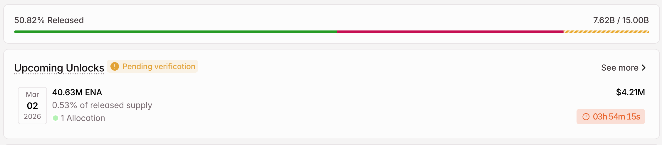 Ethena (ENA): ya desbloqueados el 2 de marzo, con aproximadamente 40.63 millones de tokens, todos en manos de la fundación.