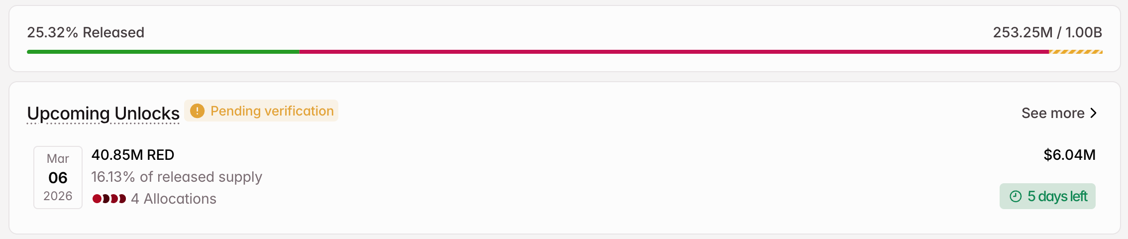 Impacto relativo (RED): aunque en monto es menor, su proporción en circulación (16.13%) es la más alta entre los tres. Sin suficiente profundidad de compra, una alta proporción de desbloqueo puede amplificar la volatilidad del precio.