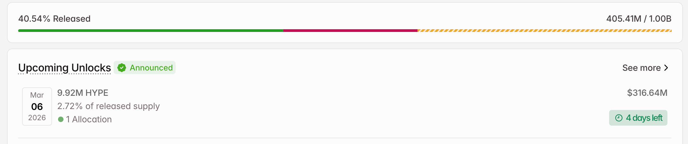 Hyperliquid (HYPE): desbloqueo previsto para el 6 de marzo de aproximadamente 9.92 millones de tokens, principalmente distribuidos a contribuyentes clave.
