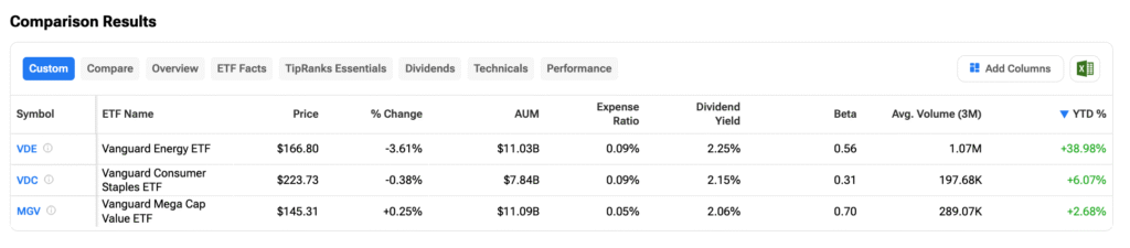 De acuerdo con el consenso único de analistas de ETF de TipRanks, determinado en base a un promedio ponderado de las calificaciones de analistas sobre sus participaciones, los tres ETF son Compras Moderadas. El ETF VDE ofrece un potencial alcista del 7%, mientras que VDC y MGV ofrecen un potencial alcista más alto de más del 15%.