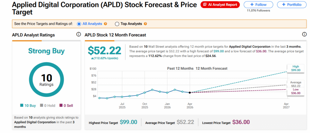Los analistas tienen una calificación de consenso de Compra Fuerte en APLD, basada en 10 compras asignadas durante los últimos tres meses. El objetivo de precio promedio de APLD de $52.22 implica aproximadamente un 113% de potencial alcista desde los niveles actuales de cotización.