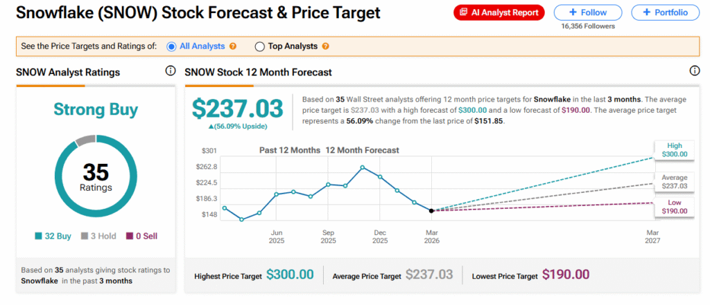 Las acciones de Snowflake han caído alrededor de un 31% en lo que va del año, pero aún se mantienen como una Compra Fuerte según la calificación de consenso de los analistas y ofrecen alrededor de un 56% de potencial alcista. Esto se basa en un objetivo de precio promedio de $237.03.