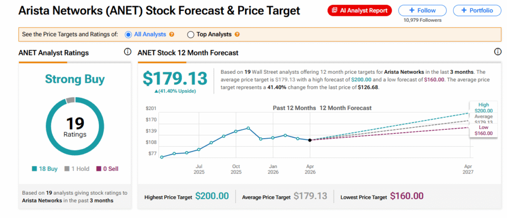 La empresa también utiliza IA para automatizar tareas como análisis de amenazas y solución de problemas de red. ANET cuenta con una calificación de consenso de Compra Fuerte por parte de los analistas y ofrece alrededor de un 41% de potencial alcista basado en un objetivo de precio promedio de $179.13.