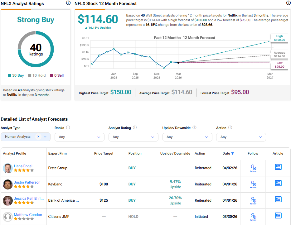 Volviendo a Wall Street, los analistas tienen una calificación de Consenso de Compra Moderada para la acción de NFLX, basada en 30 Compras, 10 Mantenimientos y cero Ventas asignadas en los últimos tres meses, según se indica en el gráfico a continuación. Además, el objetivo de precio promedio de NFLX de $114.60 por acción implica un potencial alcista del 16.2%.