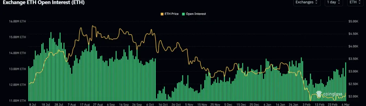 La hausse de la plus grande altcoin du marché s’accompagne d’une explosion du volume des contrats ouverts (OI), qui atteint actuellement 13,43 millions d’ETH — le plus haut depuis le 31/1. Depuis le 19/2, l’OI d’ETH augmente régulièrement, ajoutant 1,2 million d’ETH en seulement deux semaines. Ce mouvement intervient alors que le marché a enregistré 152 millions de dollars de liquidations d’ETH au cours des dernières 24 heures, dont 129 millions de dollars en positions short, selon les données de Coinglass.