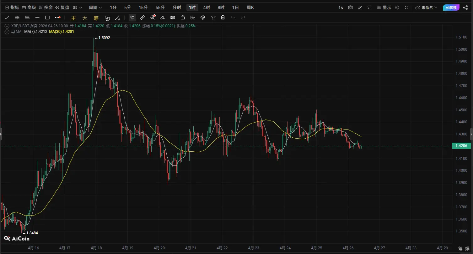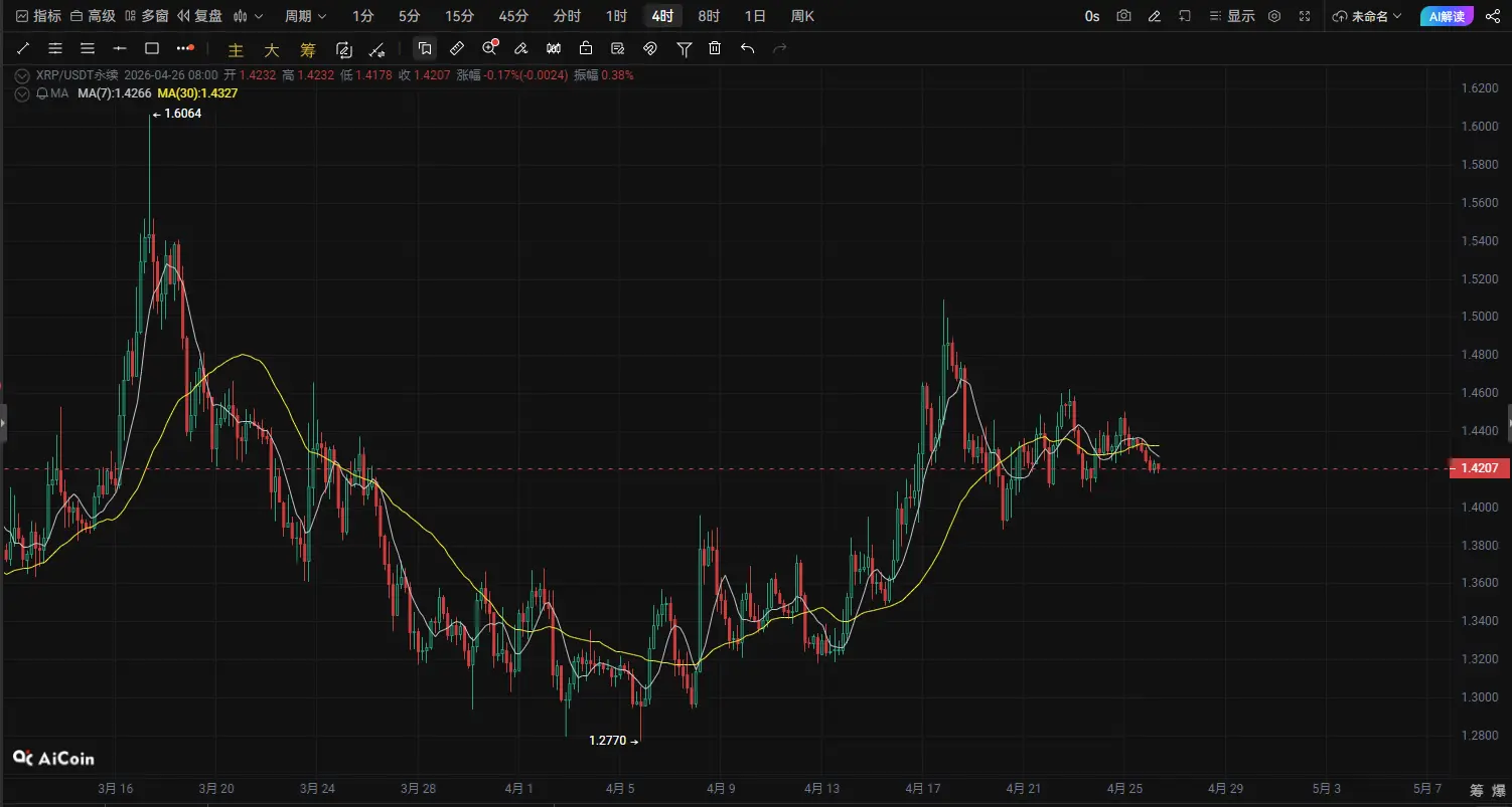 D’un point de vue général, après avoir atteint un sommet de 3.38, le XRP est entré dans une tendance clairement baissière. Bien qu’il y ait eu une consolidation latérale dans la zone 1.30—1.50 récemment, la force de la reprise est toujours limitée, plusieurs tentatives de rebond ayant été réprimées, ce qui indique que la pression de vente demeure au-dessus.