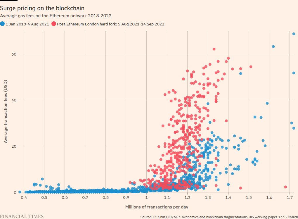 Biaya gas — biaya transaksi yang dibayar pengguna agar transaksi diproses dan dicatat di blockchain — telah meningkat seiring volume transaksi. Biaya ini ditetapkan melalui lelang sehingga, saat permintaan tinggi, perang penawaran bisa terjadi di antara pengguna yang bersaing agar transaksi mereka diproses terlebih dahulu: