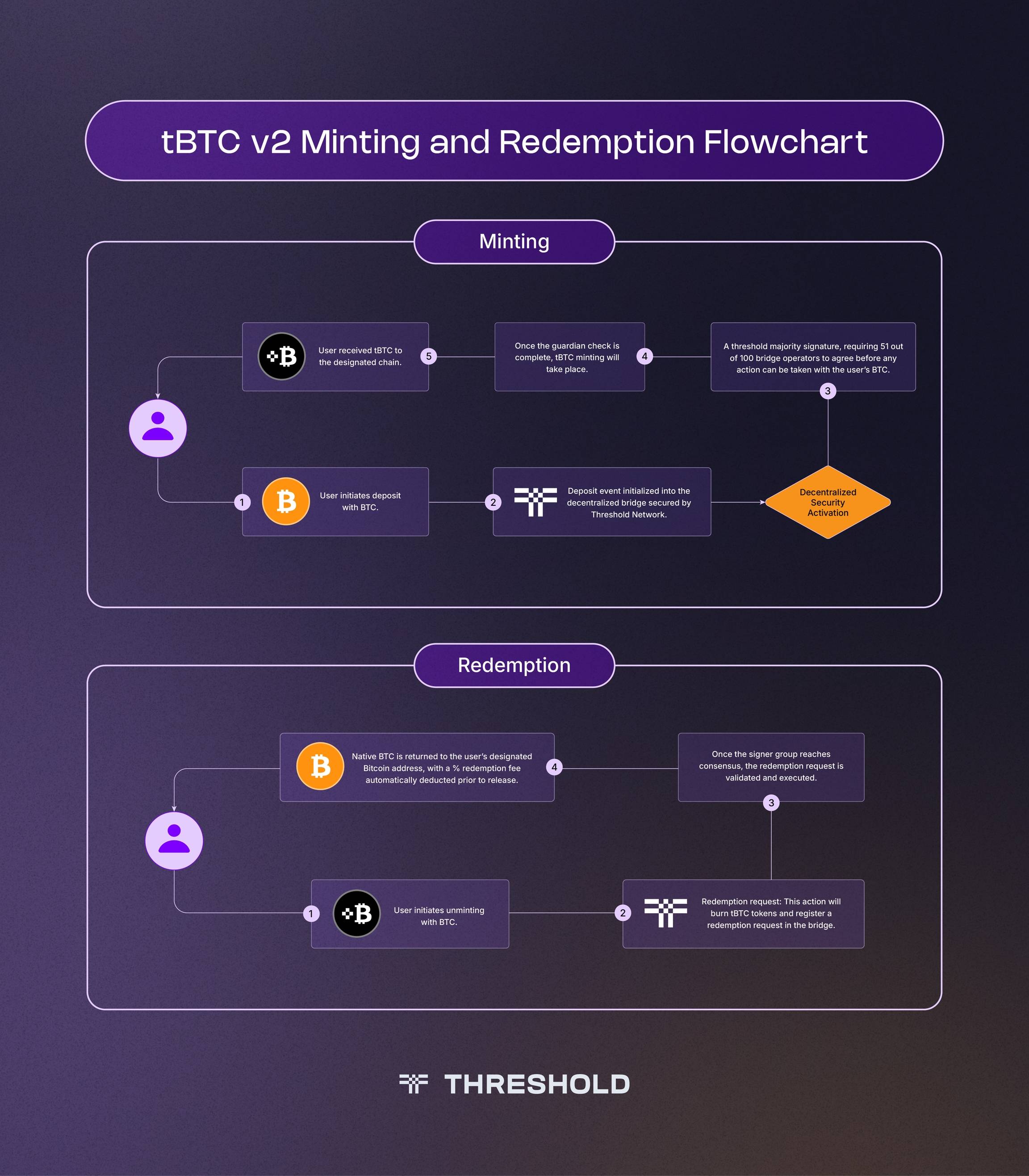 tBTCは集中化された仲介を使用せず、ランダムに選ばれた一組の(Threshold Network)上で運営されているノードのオペレーターを使用して、閾値暗号技術を通じて預けられたビットコインを保護します。これは、tBTCがオペレーターに対し、ユーザーのビットコインに対して何らかの操作を行う前に、閾値の多数の同意を得ることを要求することを意味します。毎週オペレーターをローテーションすることで、tBTCは個人やオペレーターグループが共謀して基盤となる預金を不正に盗むことを防ぐことができます。誠実な多数の仮定に基づき、tBTCのユーザーはハードウェアや人間ではなく、数学を信頼します。
