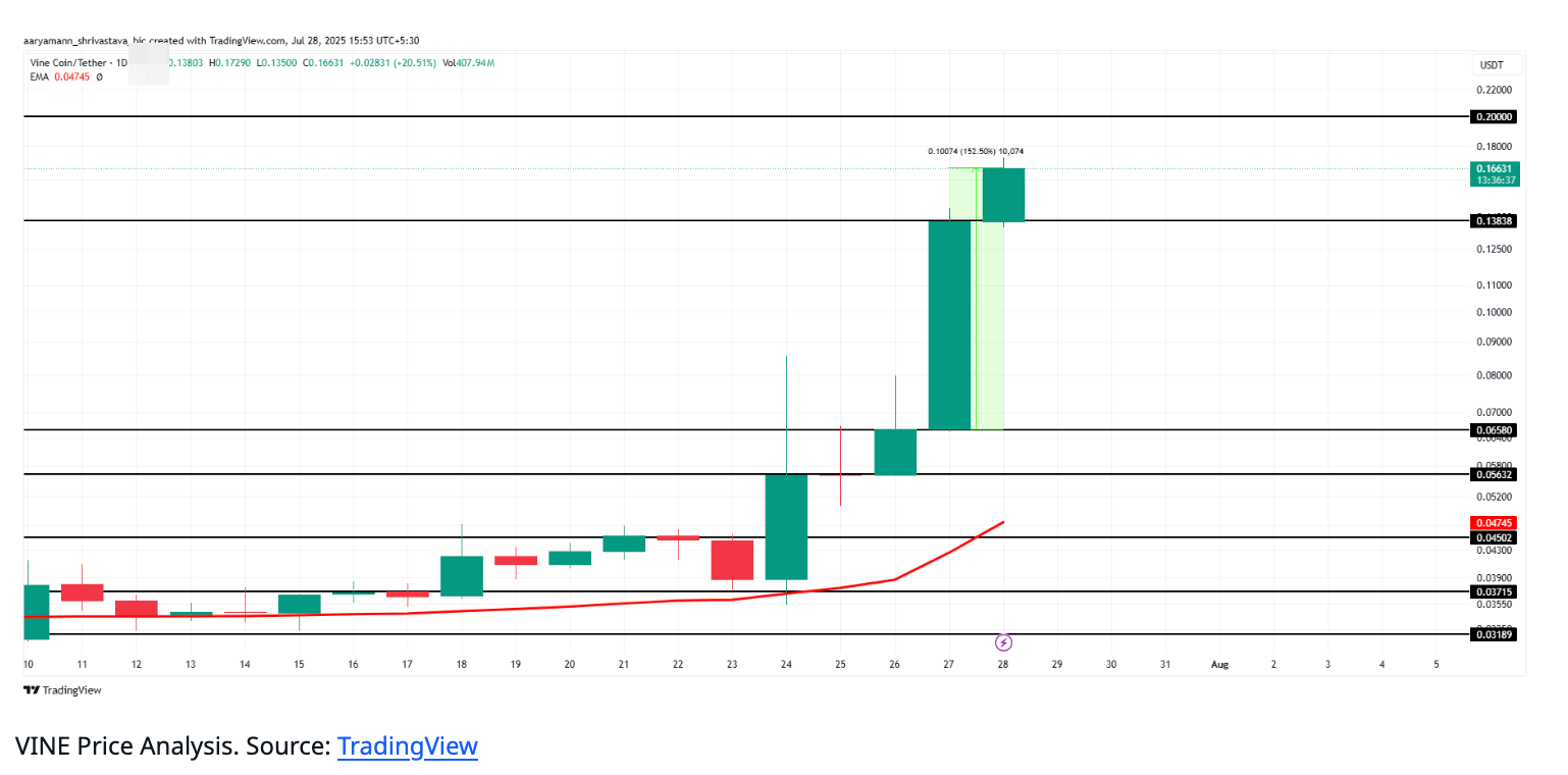 VINEは驚異的な成長を示し、過去24時間で価格が152%上昇しました。このMeme通貨は現在$0.166で取引されており、日内で最も目立つトークンの1つとなっています。この急激な上昇は、その価格動向の強いモメンタムを示しており、アルトの短期機会を求める投資家の関心を引き寄せています。