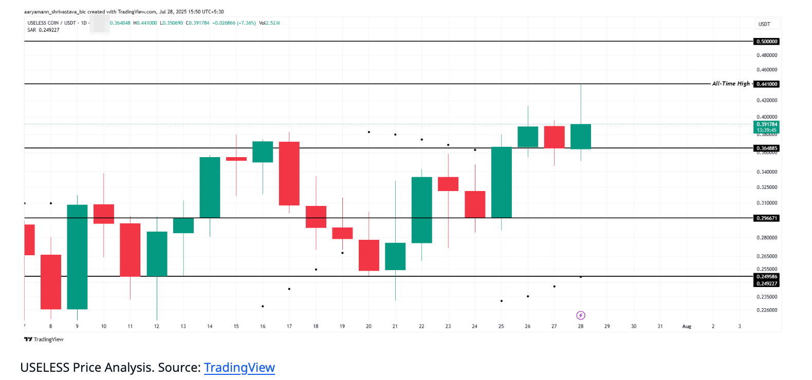USELESS は最近上昇の仲間入りをし、$0.441 の歴史的な最高値(ATH)を記録しました。このMeme通貨は現在 $0.364 のサポートラインの上で安定しており、上昇の力を示しています。この積極的なトレンドの勢いが続けば、価格はさらなる上昇が期待されます。
