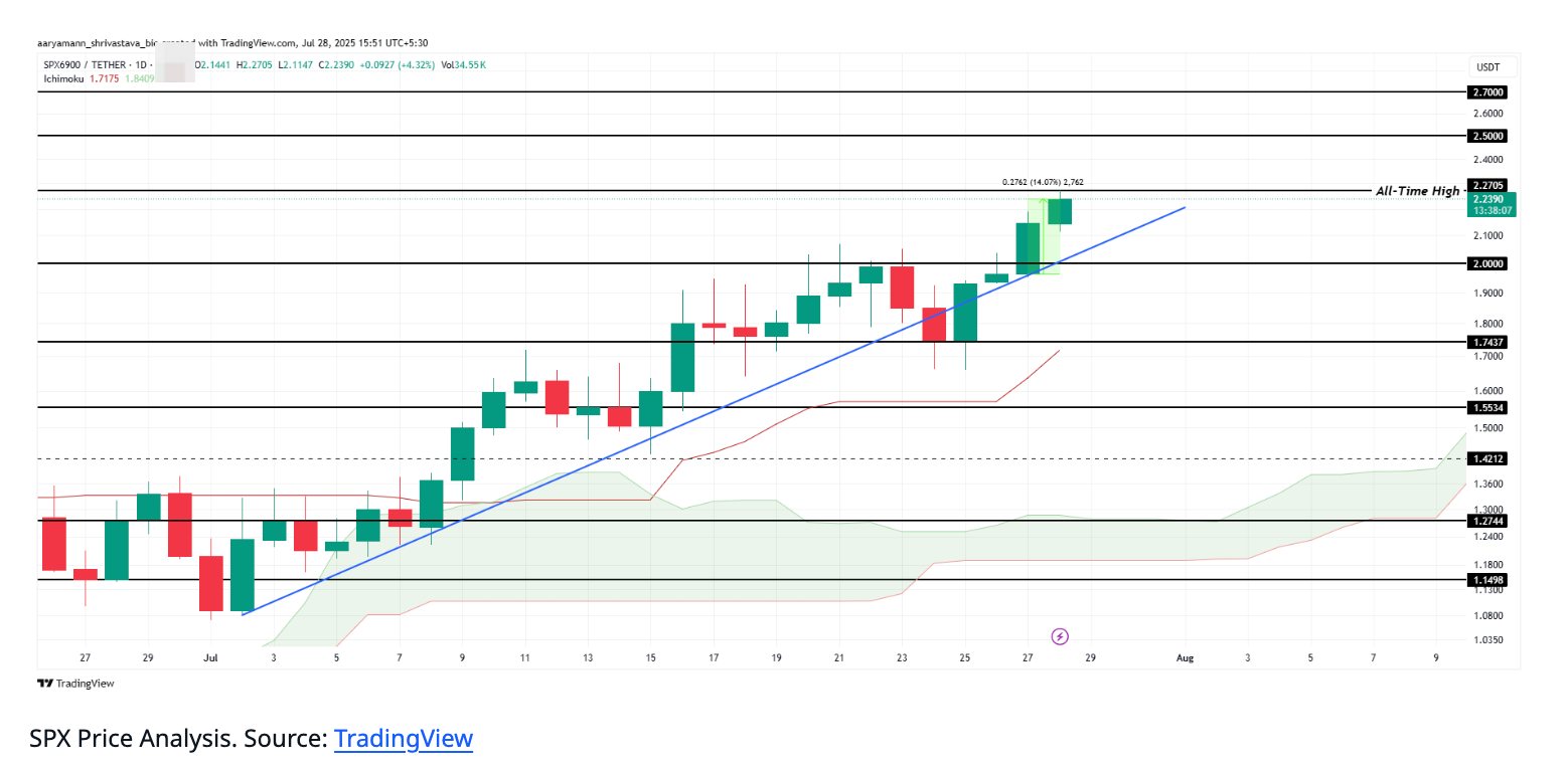 SPX 現在の取引価格は $2.23で、過去24時間で14%上昇しました。一目均衡図(Ichimoku Cloud)は現在、テクニカルサポートとして機能しており、強気のシグナルを発しています。これは、SPXがさらなる上昇をする可能性があり、市場の条件が有利で投資家の信頼が持続すれば、その価格は $2.50 以上に達する可能性があることを示しています。