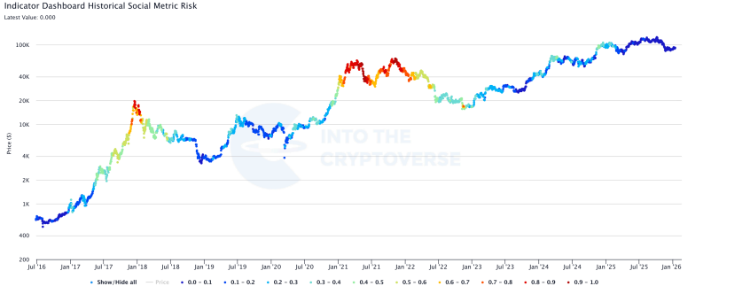 これに対し、最新のピークは広範な無関心の中で形成された。ソーシャルエンゲージメントや投機活動、リテールの関心は抑えられたままで、ビットコインが新高値をつけても変わらなかった。