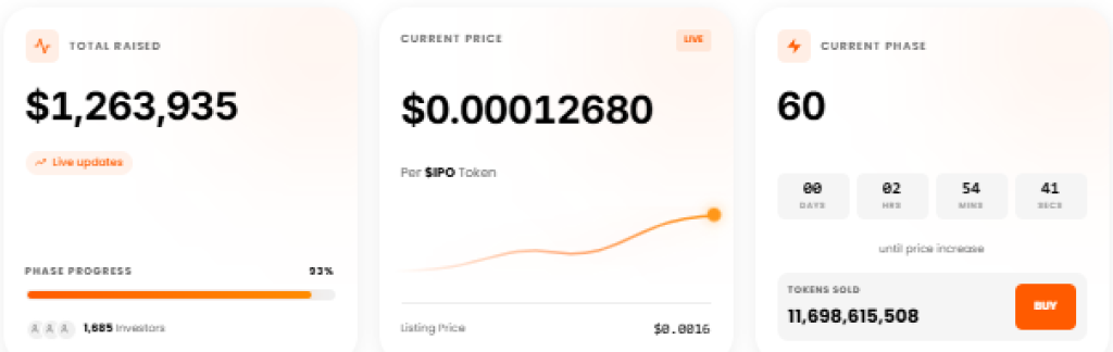 そこでIPO Genie($IPO)が登場します。ビットコインが63,000ドルから69,000ドルの間で揺れる中、IPO Genieはプレセール資金調達で120万ドルを突破。1,700以上のウォレットが参加し、110億以上の$IPOトークンが販売されました。Cryptopolitanによると