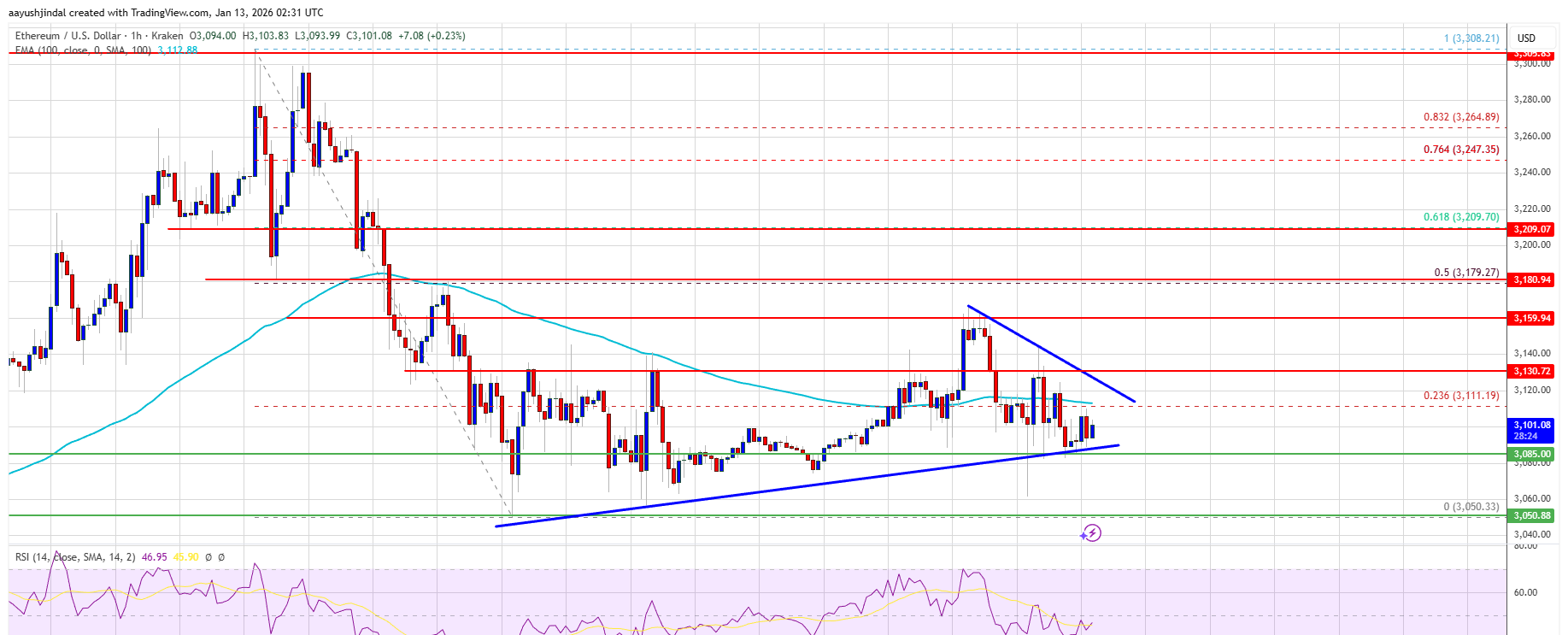 しかし、弱気派は$3,150と$3,180付近で活動しています。イーサリアム価格は現在$3,120以下で取引されており、100時間単純移動平均線も下回っています。さらに、ETH/USDの1時間チャートには、$3,085のサポートを持つ重要な強気トレンドラインが形成されています。
