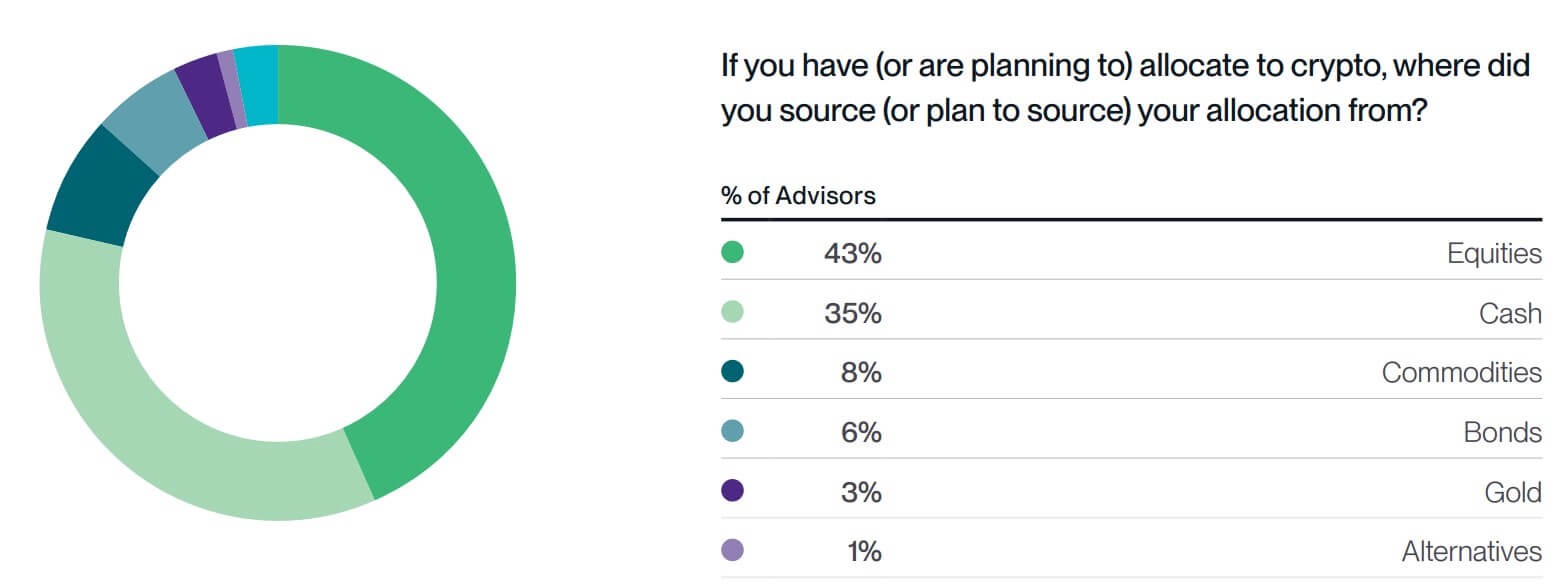 BitwiseとVettaFiの調査は、この論理が行動に反映されていることを示しています。アドバイザーが暗号資産に配分する際、43%が株式から資金を調達し、35%が現金から調達しています。