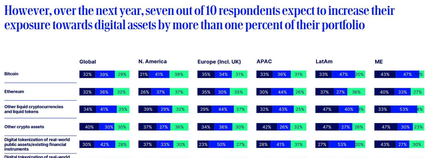 デジタル資産全体の平均ポートフォリオ配分は7%で、3年以内に16%に達する見込みです。