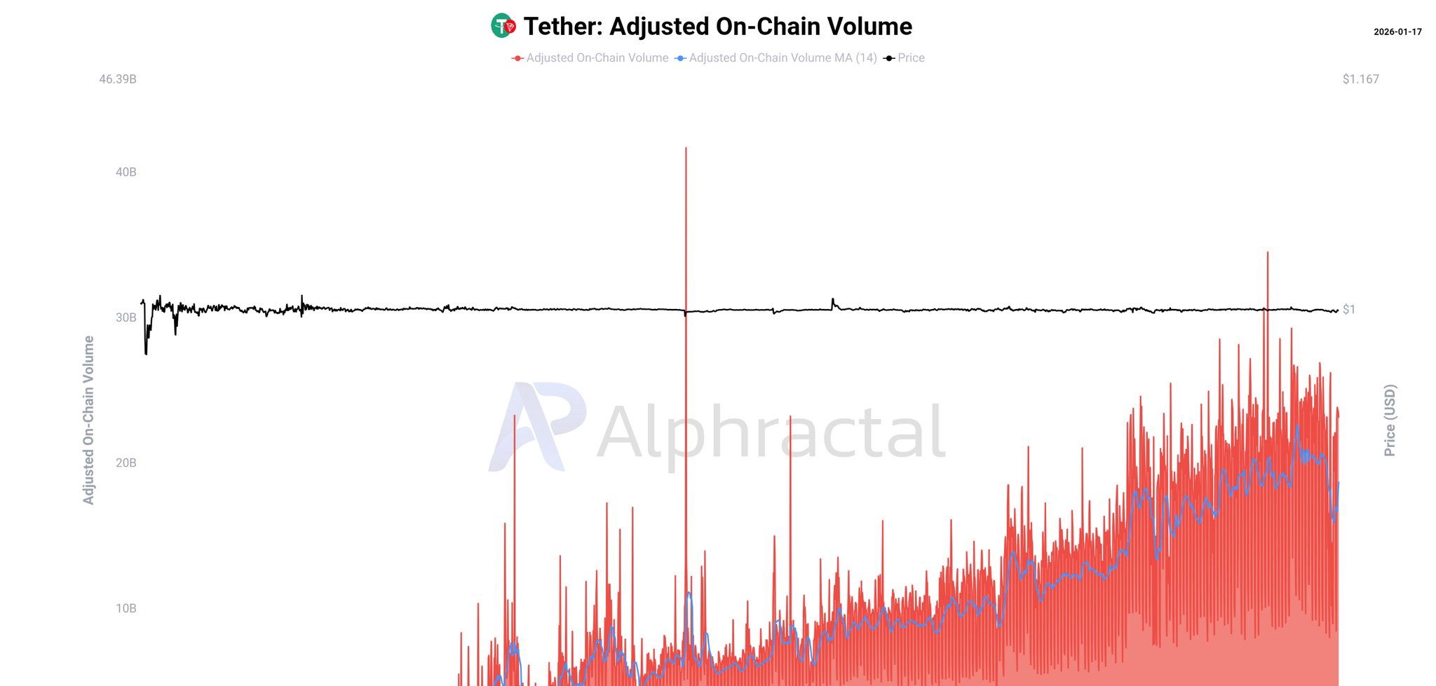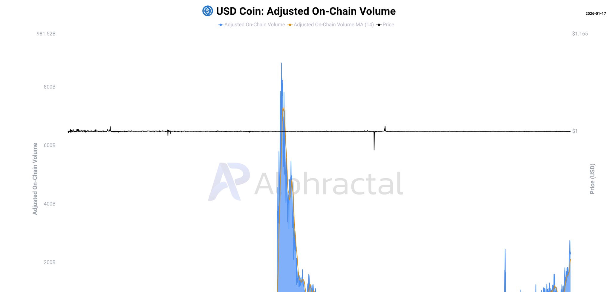一方、USDCの取引量はすべてのチェーンで引き続き増加していますが、2021年のブルマーケット時のピークにはまだ及びません。このパターンは、投機的な急増ではなく、機関投資家や財務省のような用途に沿った堅実な参加を示しています。
