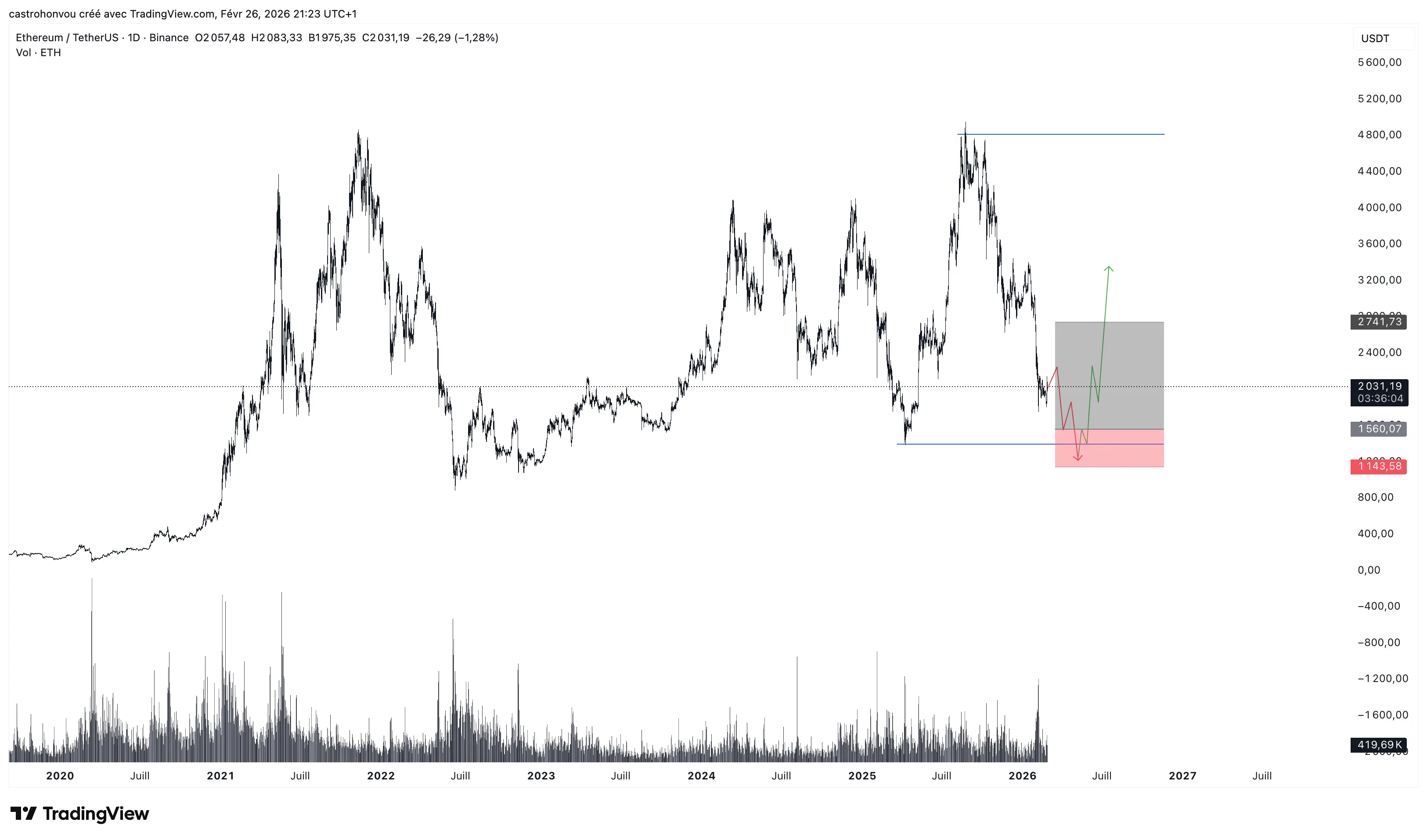 マクロの見通しは強いですが、私のテクニカル分析は短期的な調整を示唆しています。現在は1990付近にいますが、1400–1300まで下落し、流動性を取りに行くと予想しています。この「フラッシュ」が起こる前に、価格は2100–1850のゾーンに留まる可能性があります。