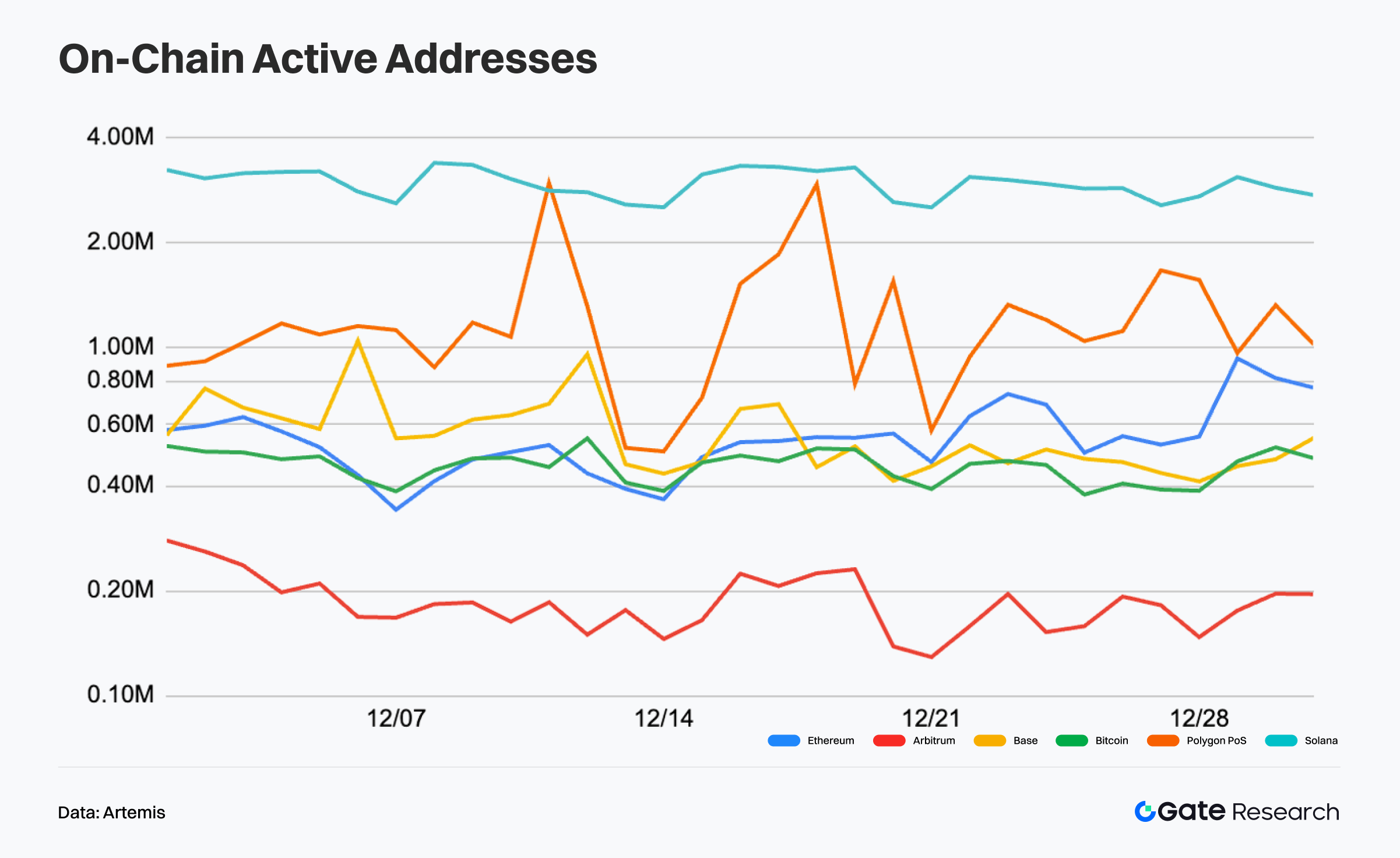 Overall, the stratification of on-chain active addresses in December was clearly defined: Solana dominated high-frequency interactions, Polygon PoS and Base maintained stable mid-tier activity, while Arbitrum remained in low-level consolidation. Divergence within the Layer 2 ecosystem became more pronounced toward year-end.