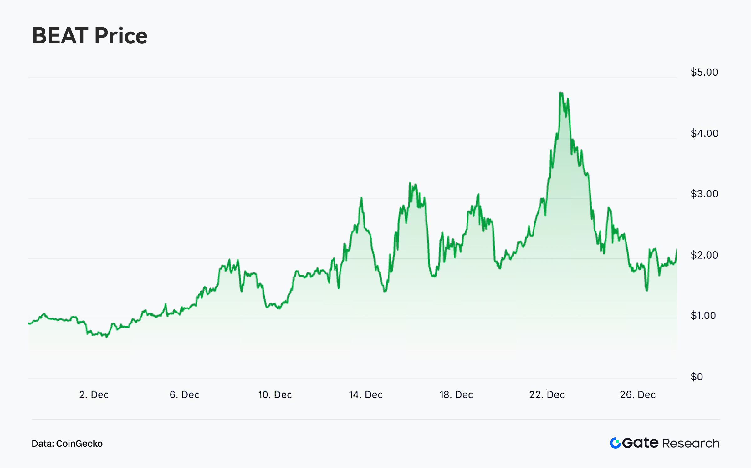 According to CoinGecko data, $BEAT recorded a peak gain of over 300% in December. This rally was not driven by a single fundamental catalyst, but rather occurred in a range-bound market environment where capital rotated out of low-volatility large-cap assets into mid- and small-cap, high-beta tokens. Prior to the rally, BEAT’s supply structure was relatively healthy, with no prolonged heavy selling pressure. Improvements in liquidity and order book depth occurred in tandem, providing favorable conditions for trend-following capital to participate. 【9】