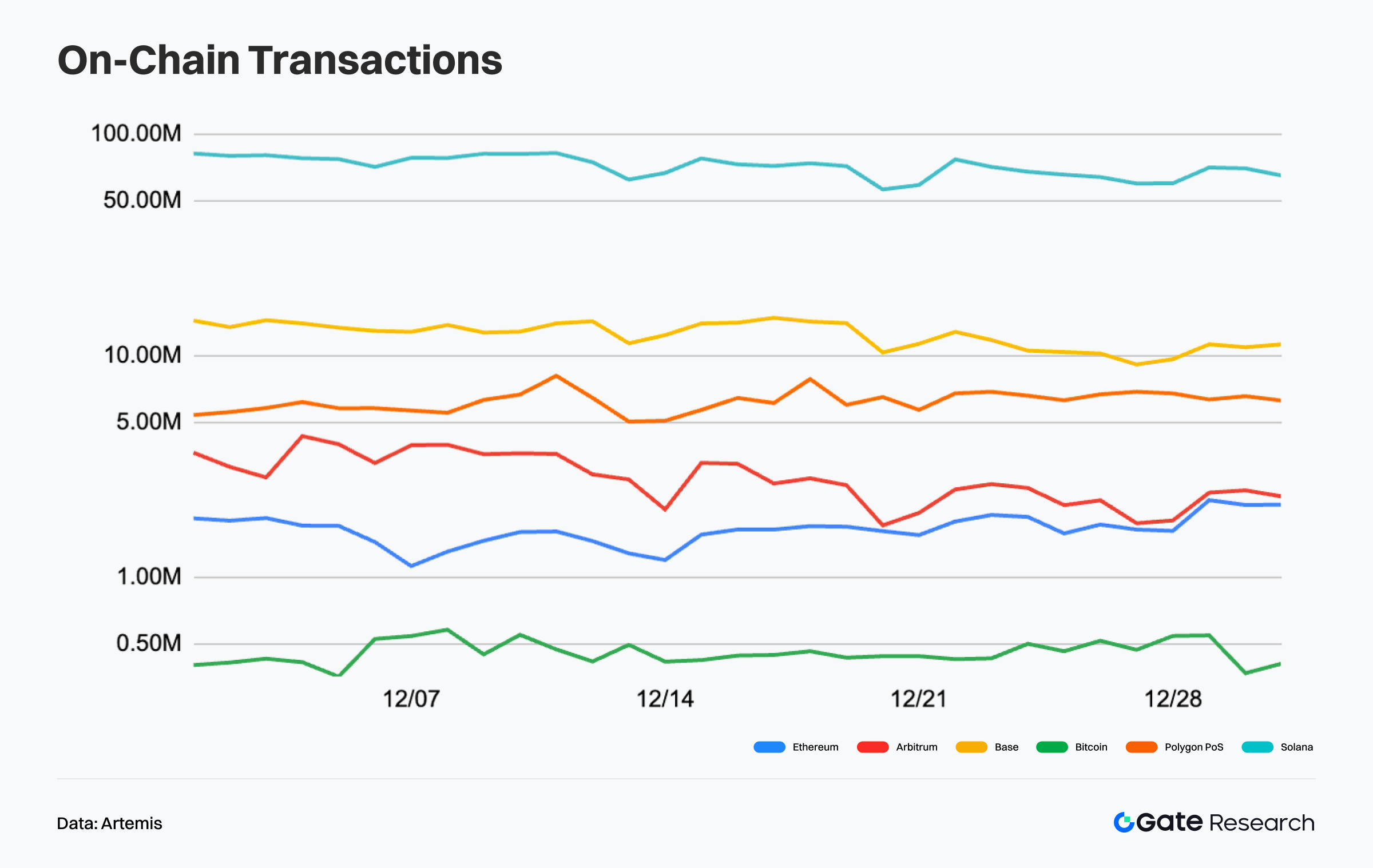 According to Artemis data, on-chain transaction activity across major public blockchains in December exhibited a pattern of high-level consolidation. Despite the market entering a year-end consolidation phase, usage intensity on core chains did not show a material decline, indicating that on-chain interaction remains supported by a solid underlying base. Solana stayed at an absolute high throughout the month, with daily transaction counts broadly holding in the range of 60–80 million. Although there were periodic pullbacks around mid-month and toward month-end, overall volatility remained limited. This reflects the stabilizing effect of high-frequency applications and an active user base on transaction volumes, demonstrating that on-chain usage intensity retained resilience even as market sentiment cooled.【1】