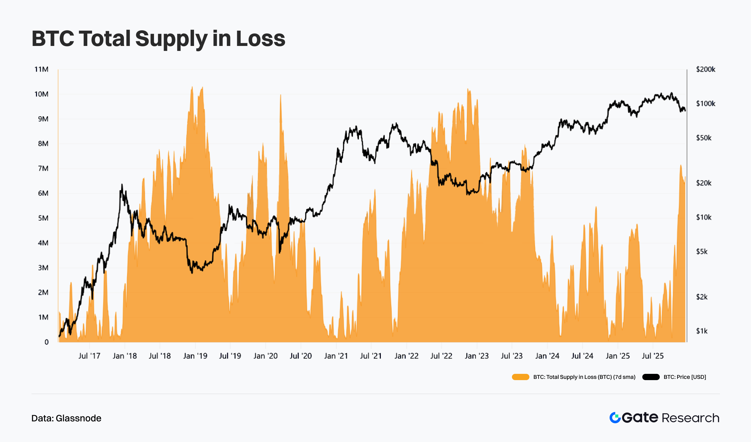 According to Glassnode data, BTC’s unrealized loss supply (7-day moving average) has increased noticeably over the past month as prices retreated from recent highs. This indicates that a portion of short-term and momentum-driven supply has moved into unrealized loss territory, raising near-term pressure. However, in absolute terms, unrealized losses remain well below the peaks observed during prior deep corrections or bear markets and have not reached levels associated with systemic panic. Instead, the current rise reflects a post-rally stress test and cooling sentiment.【6】