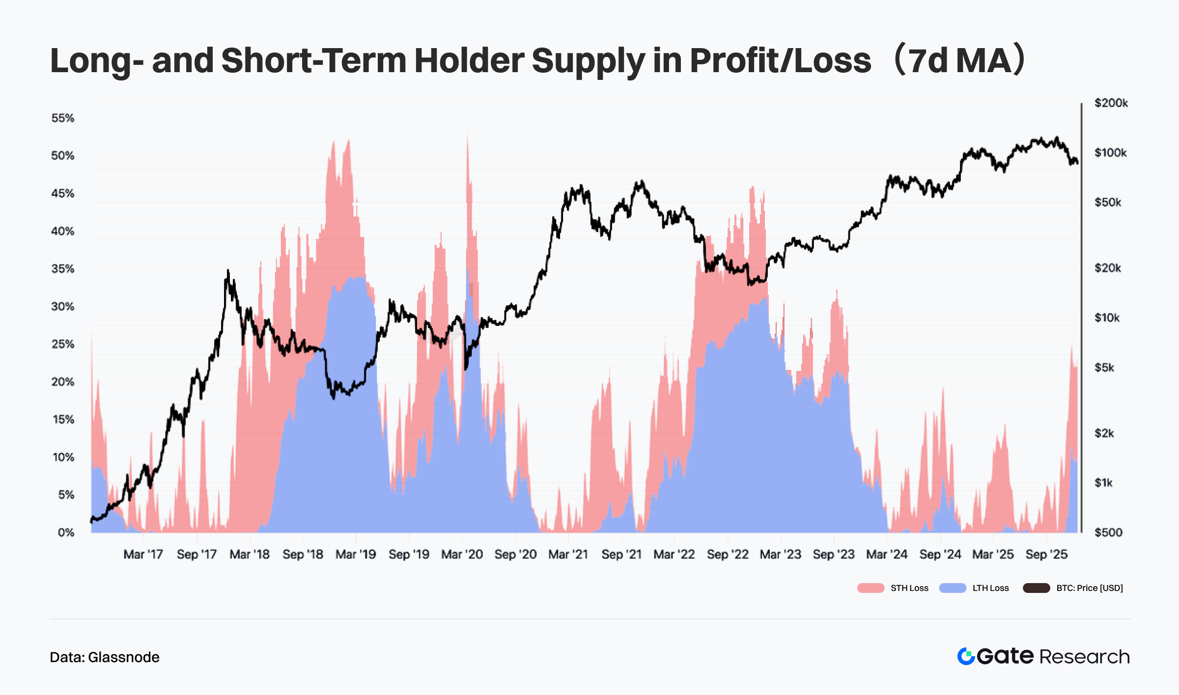 According to Glassnode data, BTC’s profit/loss supply split between long-term and short-term holders (7-day moving average) shows that over the past month, the proportion of short-term holder (STH) supply in loss has risen markedly as prices pulled back from highs. This reflects recent entrants gradually moving into unrealized loss territory, reducing short-term risk tolerance and placing the burden of market pressure primarily on short-duration supply. Such dynamics are typical of post-rally pullbacks, indicating digestion by momentum-driven capital rather than broad-based liquidation.【7】