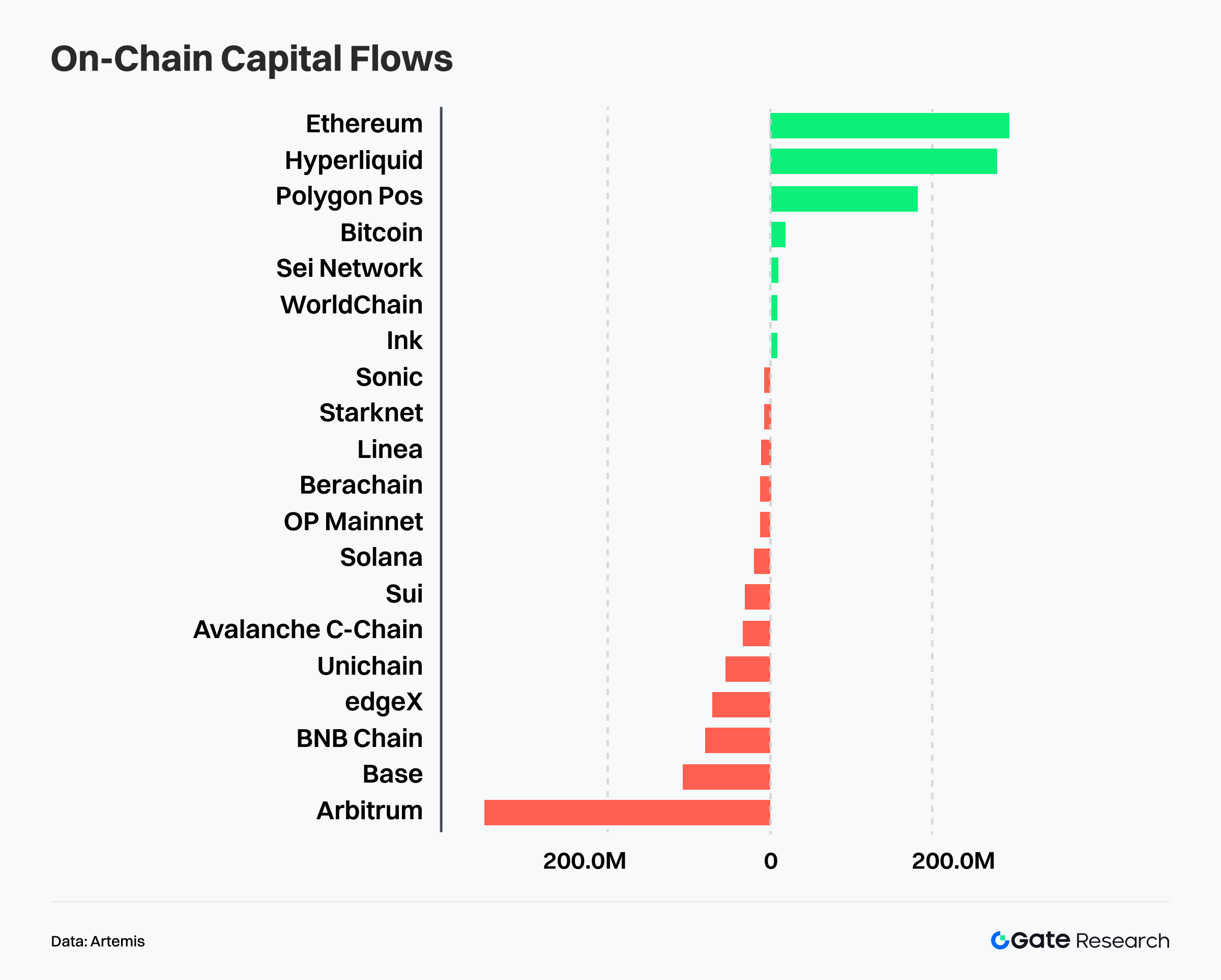 According to Artemis data, capital flows across public blockchains over the past month exhibited clear structural divergence. Rather than a broad-based expansion in risk-taking, capital was allocated in parallel according to differing risk preferences—flowing into core settlement layers with stronger safety margins, as well as into trading-oriented networks with higher capital efficiency. Meanwhile, some traditional Layer 2s and higher-valuation ecosystems faced sustained net outflow pressure.【4】